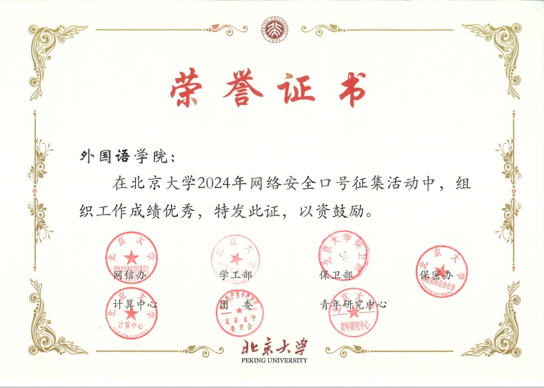 在全校师生提供的上百条应征口号中,经过网络安全宣传周主办单位、网络安全专家投票,外院三位师生提供的网络安全口号荣获北京大学2024年网络安全“十佳口号”: