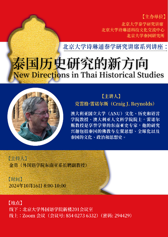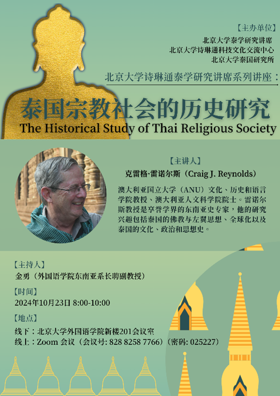2024年10月16日和10月23日,应北京大学诗琳通泰学研究讲席和北京大学诗琳通科技文化交流中心邀请,著名东南亚史和泰国史学者克雷格·雷诺尔斯(Craig J. Reynolds)教授为北京大学师生进行了两场泰国史研究的线上学术讲座。讲座采取线上线下融合的方式,线下会场设于拼搏手机版登录入口新楼201会议室。本次系列讲座也是“北京大学诗琳通泰学研究讲席系列讲座”的一部分。