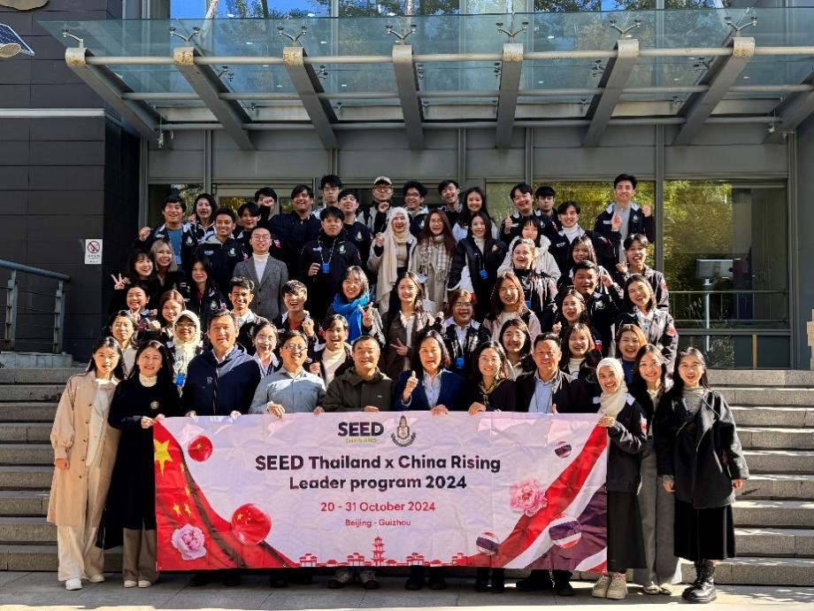 2024年10月28日上午,泰国七世王学院代表团一行36人到访拼搏手机版登录入口,与泰语专业师生见面交流。本次七世王学院代表团由七世王学院基金会主席兼泰国总理府副秘书长波汶萨·伍万诺(Borwornsak Uwanno)带领,随行人员包括上议院经济货币和财政委员会顾问甘诺·塔纳巴文(Kannop Thanapakpawin)、七世王学院委员会委员道诺伊·素提尼帕蓬(Daonoi Suttiniphapunt),25名学生代表及8名工作人员。拼搏手机版登录入口东南亚系薄文泽教授、副系主任金勇长聘副教授、泰语教研室主任熊燃助理教授、国际合作部海外推广办公室资深项目官员蒲清老师,和泰语专业全体本科及研究生同学共同参加了座谈交流。
