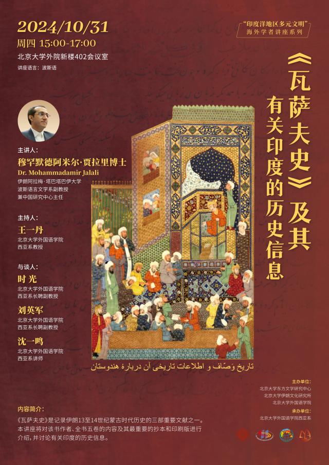 2024年10月31日,伊朗塔巴塔巴依大学中国研究中心主任穆罕默德阿米尔·贾拉里博士副教授应邀为我校师生开展题为“《瓦萨夫史》及其有关印度的历史信息”的讲座。本次讲座由北京大学东方文学研究中心、伊朗文化研究所和拼搏手机版登录入口主办,拼搏手机版登录入口西亚系承办。讲座由拼搏手机版登录入口西亚系教授王一丹主持,拼搏手机版登录入口长聘副教授时光、长聘副教授刘英军和讲师沈一鸣参与讨论。现场和线上的听众除拼搏手机版登录入口波斯语专业师生以外,还有来自北京大学历史学系、对外经济贸易大学、北京第二拼搏手机版登录入口等高校的师生。