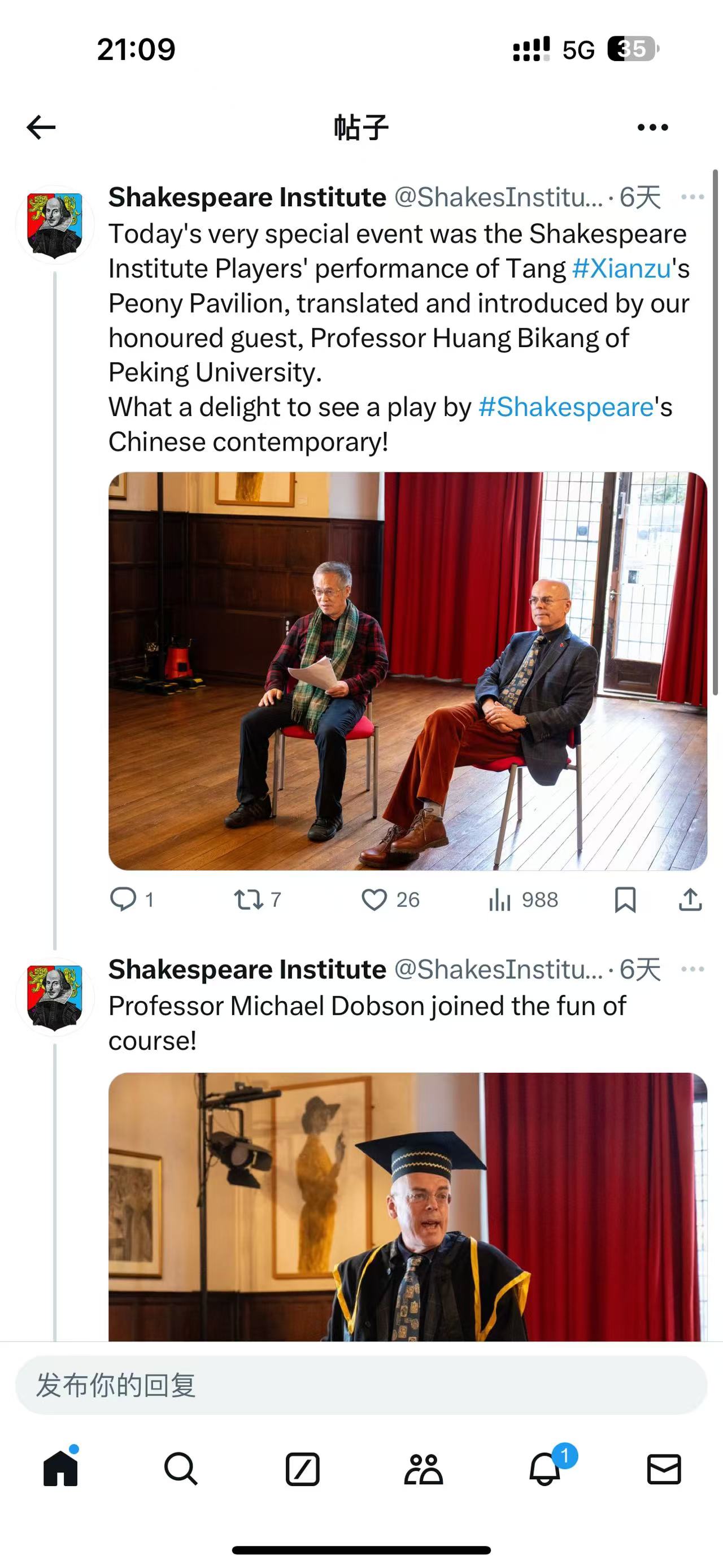 演出结束后,演出剧组全体成员与英方教授和艺术家进行了交流。黄必康教授向莎士比亚出生地信托基金和莎士比亚研究院图书馆赠送了他本人英译的《牡丹亭》(莎士比亚诗体全译本)和《莎士比亚十四行诗》(仿词全译本)。此次戏剧交流活动期间,黄必康教授和从丛教授还应邀参加了联合国教科文组织在德国驻英国大使馆举行的有关莎士比亚演出的会议,两位教授也向德国驻英副大使卡尔-马蒂阿斯·克劳斯先生(Karl-Matthias Klause)和德国莎士比亚协会会长克劳迪娅·欧克(Claudia Olk)教授赠送了莎士比亚诗体《牡丹亭》英译本。