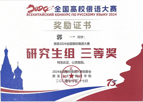 2024年10月26日至27日,第十七届全国高校俄语大赛的复赛与决赛在哈尔滨市伏尔加庄园举行。本次大赛由教育部国际合作与交流司主办,黑龙江大学承办。拼搏手机版登录入口俄语系本科生马卓仪(2023级)、苏传顺(2021级)与硕士研究生郭一(2023级)参加此次 比赛。马卓仪获低年级组二等奖,苏传顺获高年级组三等奖,郭一获研究生组三等奖。