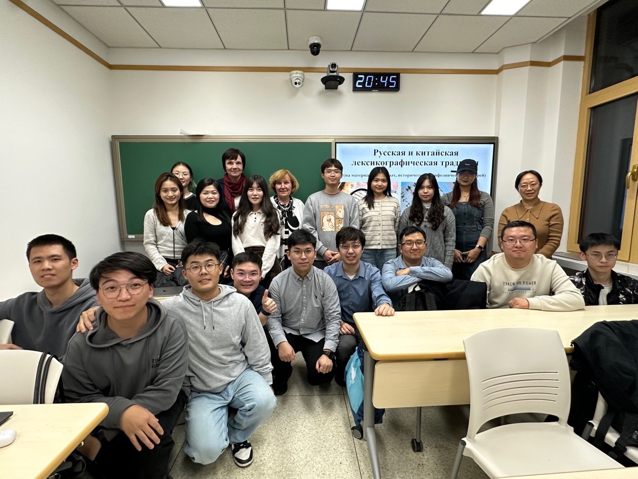 讲座结束后,沃洛申娜副教授回答了听众关于梵语和俄语研究、俄汉语词类中所涉及的语义等问题的提问。周海燕老师代表俄语系对沃洛申娜副教授为师生带来精彩讲座表示感谢。沃洛申娜副教授和与会师生合影留念,讲座圆满结束。