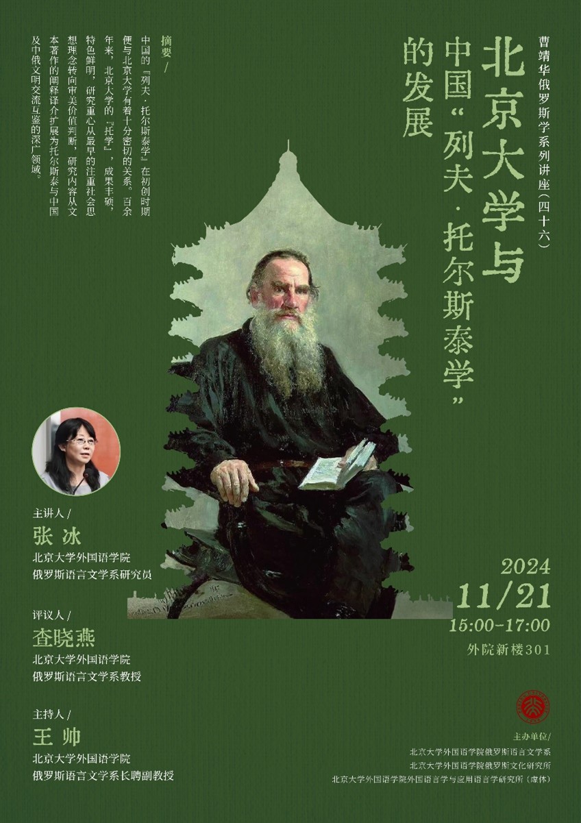 2024年11月21日下午,拼搏手机版登录入口俄罗斯语言文学系张冰研究员在拼搏手机版登录入口新楼301会议室做了一场专题讲座,主题为“北京大学与中国‘列夫·托尔斯泰学’的发展”。本次讲座系“曹靖华俄罗斯学系列讲座”第46讲,由拼搏手机版登录入口俄语系、拼搏手机版登录入口俄罗斯文化研究所、拼搏手机版登录入口外国语言学与应用语言学研究所(虚体)主办。