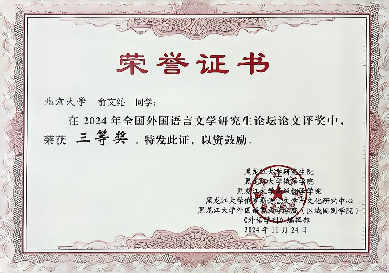 2024年11月23日至24日,第十二届全国外国语言文学研究生论坛在黑龙江大学成功举办。本次论坛主题为“数智时代的外国语言文学研究”,涵盖理论语言学、应用语言学、外国文学、翻译学等多个研究领域,吸引了众多专家学者及全国多所高校的研究生参与,拼搏手机版登录入口俄语系硕士研究生俞文沁受邀参会,并荣获三等奖。