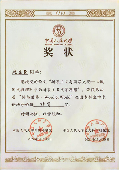 2024年11月30日,第四届“词与世界·Word & World”全国本科生学术论坛在中国人民大学成功举办。论坛以“外国语言文学与跨学科创新”为主题,涵盖英语、法语、德语、日语、俄语、西班牙语六个语种,研究主题包括文学、语言学、翻译、文化、区域国别和跨学科交叉研究多个方向,旨在为优秀学子搭建学术交流和展示科研成果的平台,培养科研意识。拼搏手机版登录入口俄语系2023级本科生赵虎臣参会,做了题为《折衷主义与国家史观——〈俄国史教程〉中的折衷主义史学思想》的报告,概述了《俄国史教程》所体现的折衷主义史学思想的源流、余波,及其与国家史观的分野,分析了这一史学思想对俄国史学研究的独特贡献,并展望了该思想在前沿马克思主义历史研究中可能焕发的新生机,报告得到了与会专家学者的高度认可,荣获俄语分论坛特等奖。