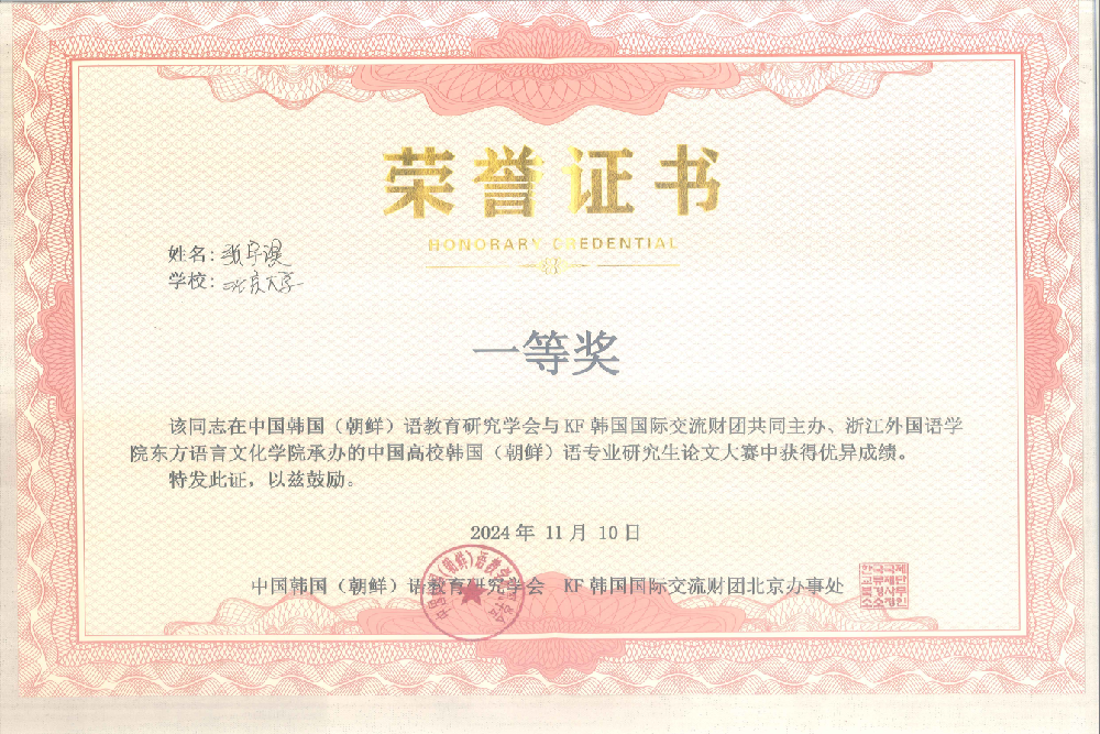喜报:朝(韩)语系硕士生张宇淏在中国高校韩国(朝鲜)语专业研究生论文大赛中获一等奖