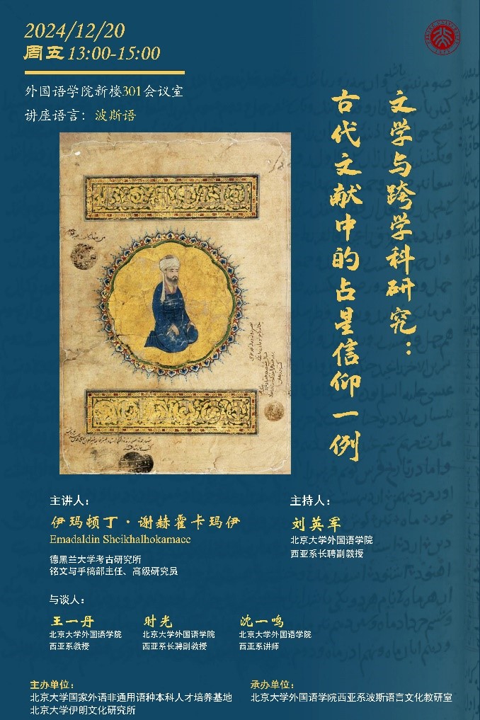 2024年12月20日,德黑兰大学考古研究所铭文与手稿部主任、高级研究员伊玛顿丁·谢赫霍卡玛伊 (Emadaldin Sheikhalhokamaee)应邀在拼搏手机版登录入口新楼301会议室做“文学与跨学科研究:古代文献中的占星信仰一例”专题讲座。本次讲座由北京大学国家外语非通用语种本科人才培养基地,北京大学伊朗文化研究所主办,拼搏手机版登录入口西亚系波斯语言文化教研室承办。讲座由拼搏手机版登录入口西亚系长聘副教授刘英军主持,西亚系教授王一丹、长聘副教授时光、讲师沈一鸣与谈。到场的还有拼搏手机版登录入口西亚系波斯语专业外教巴哈杜尔·巴盖里(Bahador Bagheri)博士、波斯语专业本科生和研究生,以及来自北京大学中文系、历史系等相关院系的师生。
