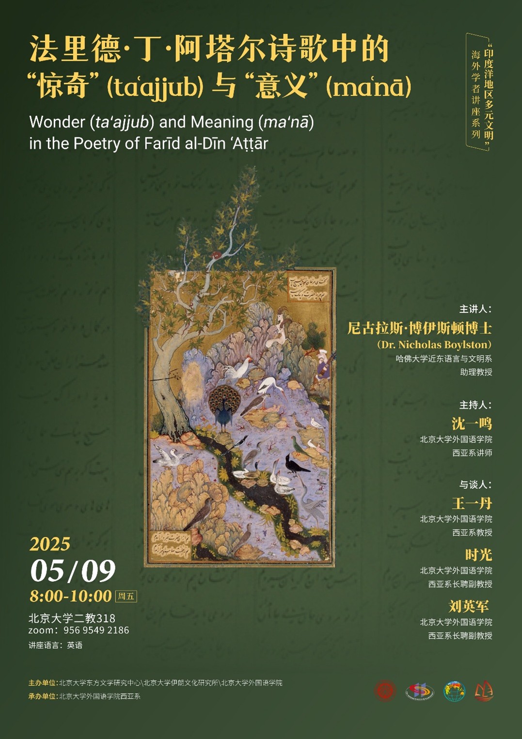 2025年5月9日上午,哈佛大学近东语言与文明系助理教授尼古拉斯·博伊斯顿博士(Dr. Nicholas Boylston)在线上为北京大学师生做了主题为“法里德·丁·阿塔尔诗歌中的‘惊奇’(ta‘ajjub)与‘意义’(ma‘nā)”的讲座。本次讲座是“印度洋地区多元文明”海外学者讲座系列之一,由北京大学东方文学研究中心、北京大学伊朗文化研究所和拼搏手机版登录入口主办,拼搏手机版登录入口西亚系承办。讲座由拼搏手机版登录入口西亚系讲师沈一鸣主持,西亚系教授王一丹、长聘副教授时光、长聘副教授刘英军与谈。到场的还有波斯语专业本科生,以及来自北京大学中文系、历史学系和经济学院等院系的师生。