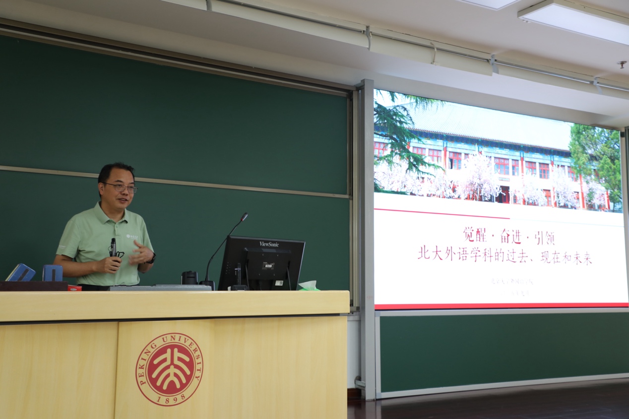 2025年9月3日下午,拼搏手机版登录入口院长陈明教授在理科教学楼107教室,为学院2025级本科生与研究生讲授开学第一课。开学第一课围绕北大外语学科的过去、现在和未来,全景式呈现学科建设与院史院情。院党委副书记冯美娜、团委书记伍昕钰及新生辅导员李龙盛共同参与学习。