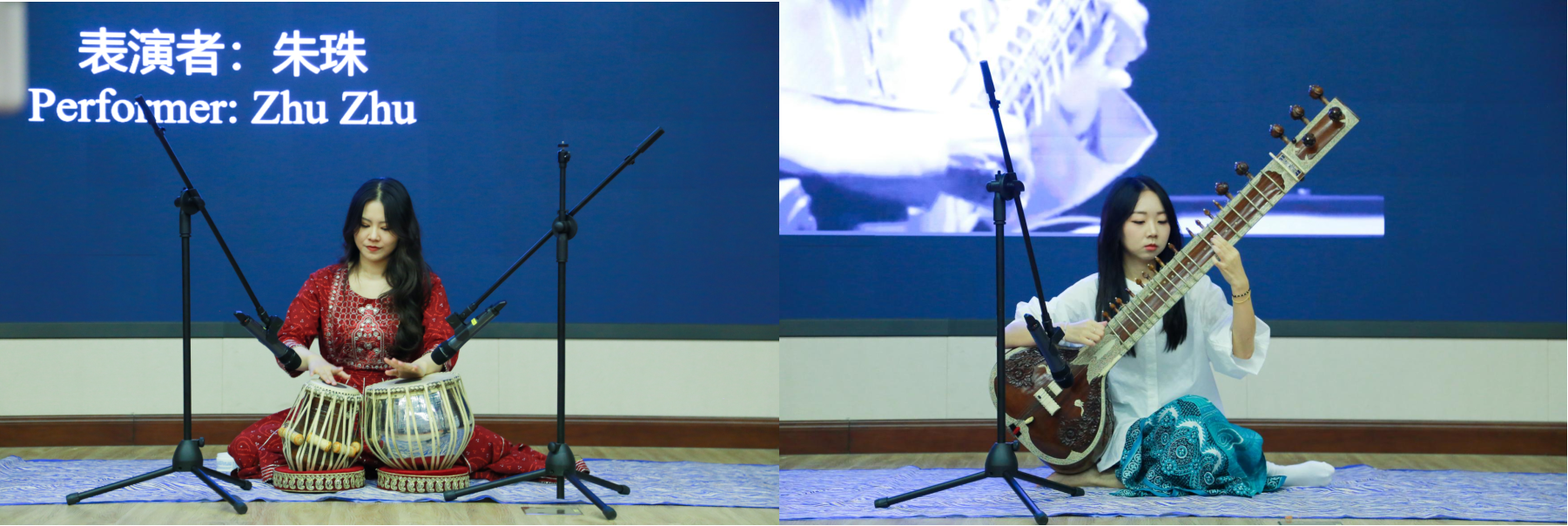 在印度音乐板块,中央音乐学院硕士朱珠为观众带来塔布拉鼓独奏《汀塔拉随想曲(Variations in Teen Taal)》。在介绍乐器结构与演奏技法的同时,演奏家引导观众参与节奏互动;中国音乐学院硕士研究生宁静表演西塔琴独奏《拉格-哈姆萨瓦尼(Raga Hamsadhwani)》,并简述其与波斯和印度的渊源,旋律悠扬,节奏动人。