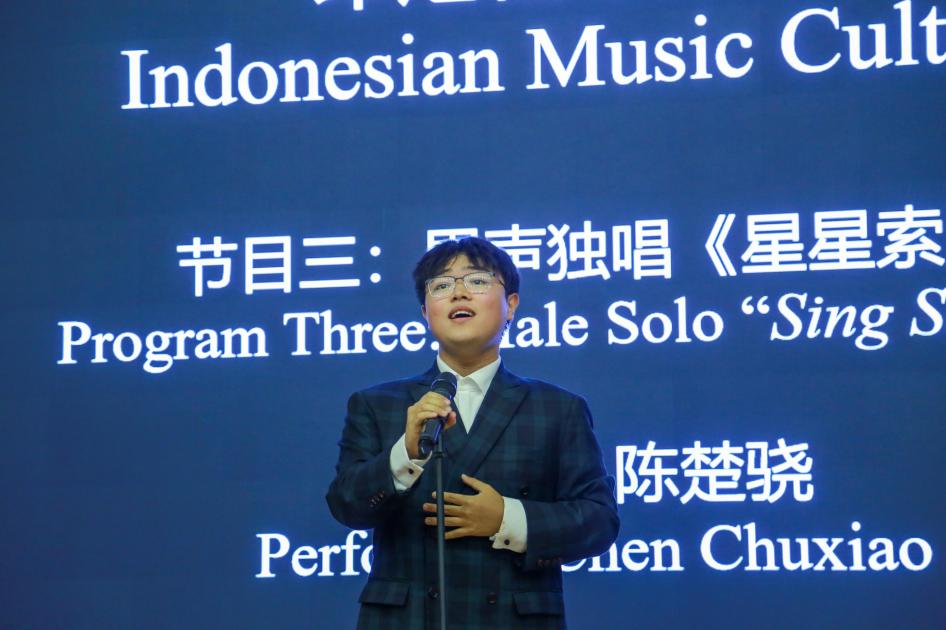 在印尼音乐板块,中央音乐学院学生、青年男高音陈楚骁演唱融合苏门答腊船歌与克隆钟元素的《星星索(Sing Sing So)》,生动对比美声、印尼唱法与中国传统唱法,并献唱由古诗改编的《越人歌》。