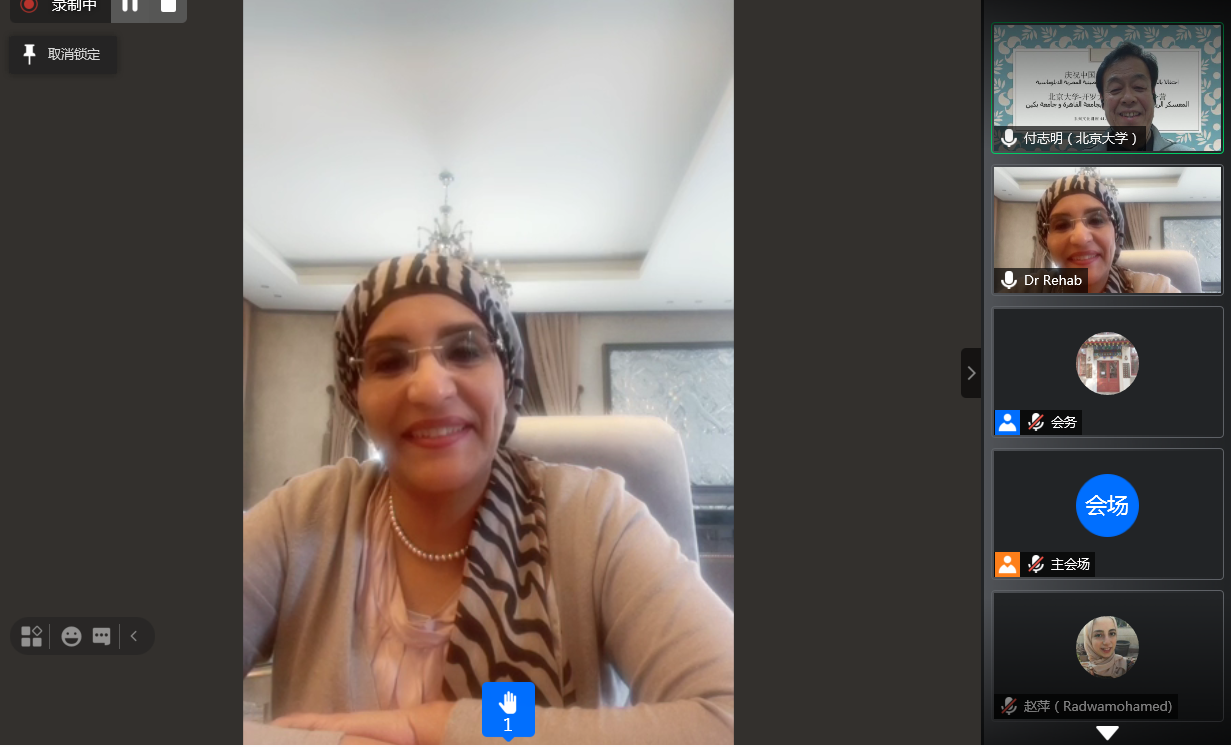 付志明教授详细介绍了“中非高校20+20合作计划”,分享了北京大学与开罗大学结成了一对一的校际合作之后组织的多项合作项目,回顾了项目成立以来双方开展的文化交流和学术研讨活动,并对疫情期间李哈布院长在翻译抗击疫情文件当中提供的帮助表示了感谢。付教授表示希望中埃两国都能够尽快战胜疫情,期待尽快恢复到线下交流的方式。