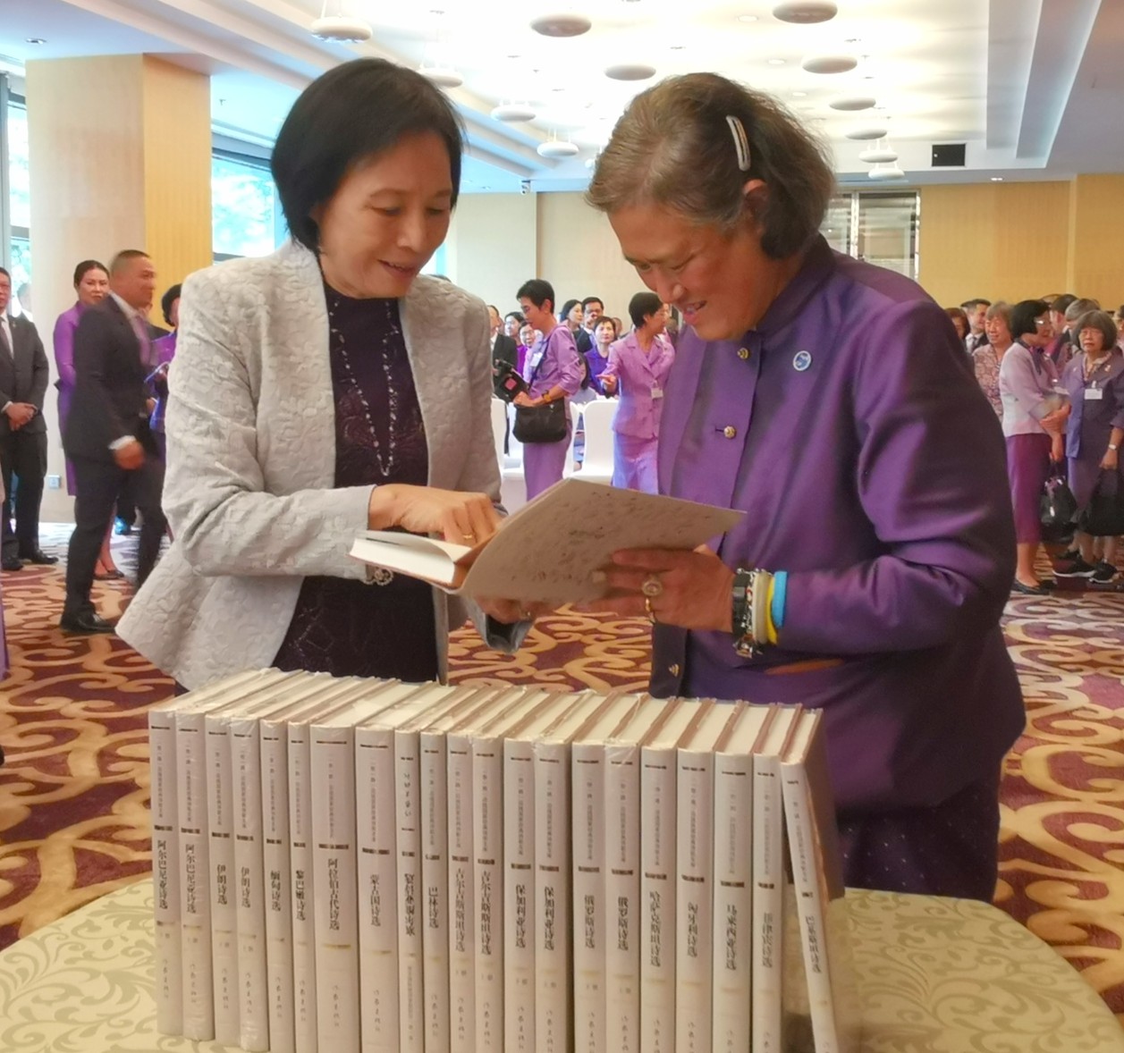 2019年9月29日下午,泰王国诗琳通公主在参加完中华人民共和国国家勋章和国家荣誉称号颁授仪式之后,前往北京丽思卡尔顿酒店宴请前任中国驻泰大使和公主的汉语教师代表。我国泰语界著名专家、翻译家、诗琳通讲席教授裴晓睿受邀参加了此次宴请活动,并作为译者之一向公主赠送了由北大拼搏手机版登录入口、北大中国诗歌研究院和作家出版社联合策划出版的《“一带一路”沿线国家经典诗歌文库》(第一辑)一套。