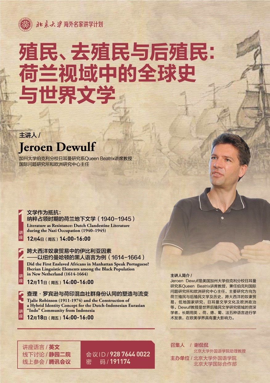 2020年12月,拼搏手机版登录入口在国际合作部“海外名家讲学计划”的支持下主办了三场题为“殖民、去殖民与后殖民:荷兰视域中的全球史与世界文学”的系列讲座。主讲人杰罗恩•德伍夫(Jeroen Dewulf)是加利福尼亚大学伯克利分校日耳曼研究系贝娅特丽克丝女王讲席教授(Queen Beatrix Chair Professor),兼任伯克利国际问题研究所和欧洲研究中心主任,主要研究方向为荷兰殖民与后殖民文学及历史,跨大西洋的奴隶贸易,低地国家文化,日耳曼文学及欧洲政治等。德伍夫教授是世界殖民与后殖民研究领域的资深学者,长期用英 、荷、德、葡、法五种语言进行学术发表,在欧美学界具有重大影响力。受疫情影响,德伍夫教授未能到达燕园现场,因此系列讲座以线上线下相结合的方式进行,演讲同时在腾讯会议、哔哩哔哩等网上平台上直播,吸引了北京大学校内外的众多学者和同学观看、学习和讨论。