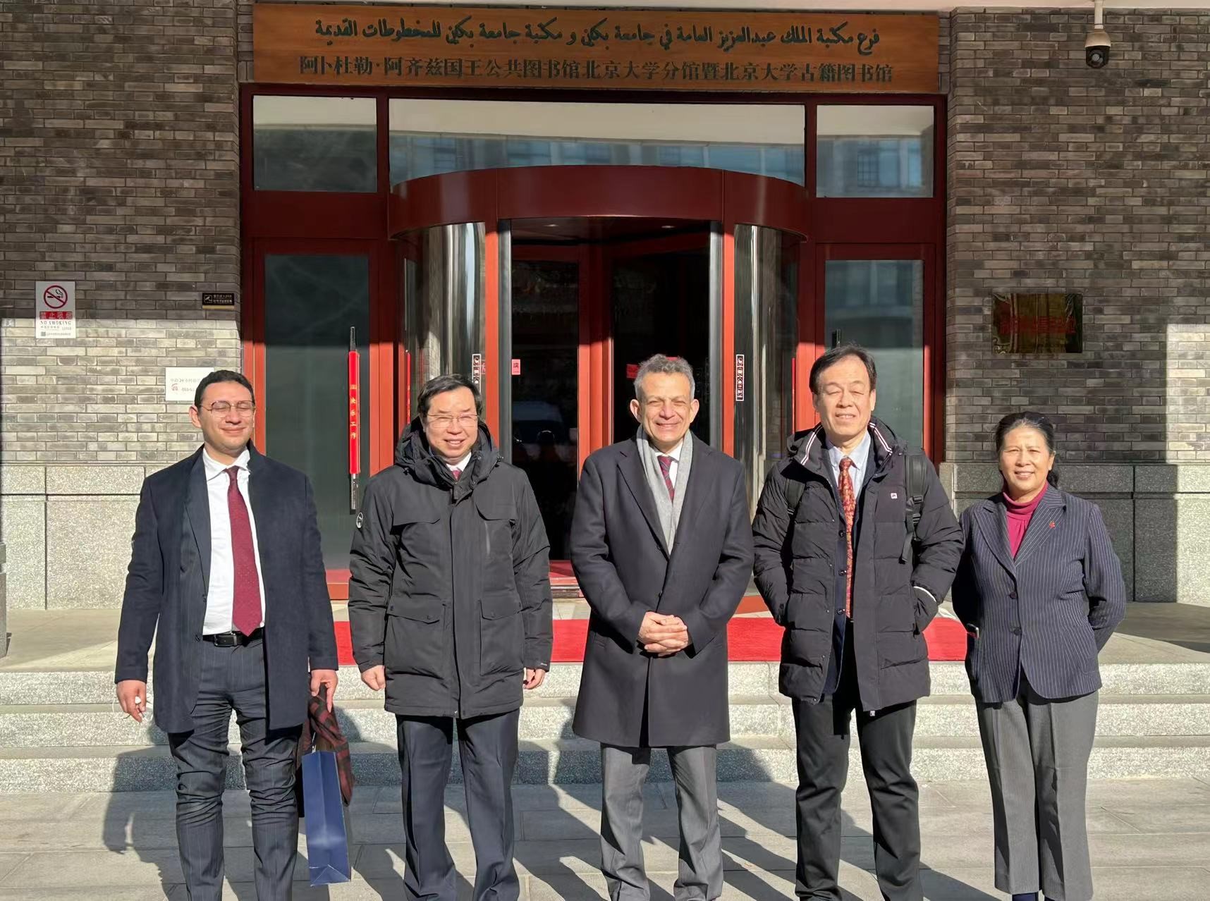 会见后,哈奈菲大使一行首先前往阿卜杜勒·阿齐兹国王公共图书馆北大分馆参观。分馆工作人员向哈奈菲大使介绍了分馆的服务内容和馆藏图书情况。大使还在北大阿语系老师的陪同下参观了分馆的中阿书法艺术展览。大使表示,分馆丰富的阿拉伯语文献资源及其为增进中阿文化交流发挥的积极作用令人印象深刻。