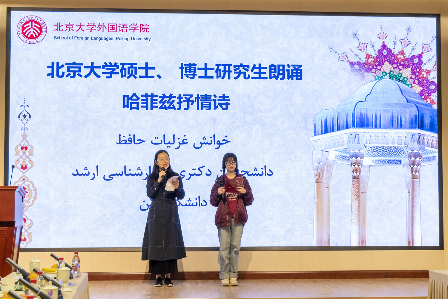 在座谈间隙,波斯语专业的本科生、硕士以及博士研究生朗诵了多首哈菲兹抒情诗,活跃了气氛。同时,中伊双方代表用哈菲兹诗集占卜,共同庆祝哈菲兹纪念日。在活动的最后,陈明院长与巴赫蒂亚尔大使代表宾主双方互赠纪念品,伊朗使馆还向波斯语教研室赠送了一批波斯语书籍。