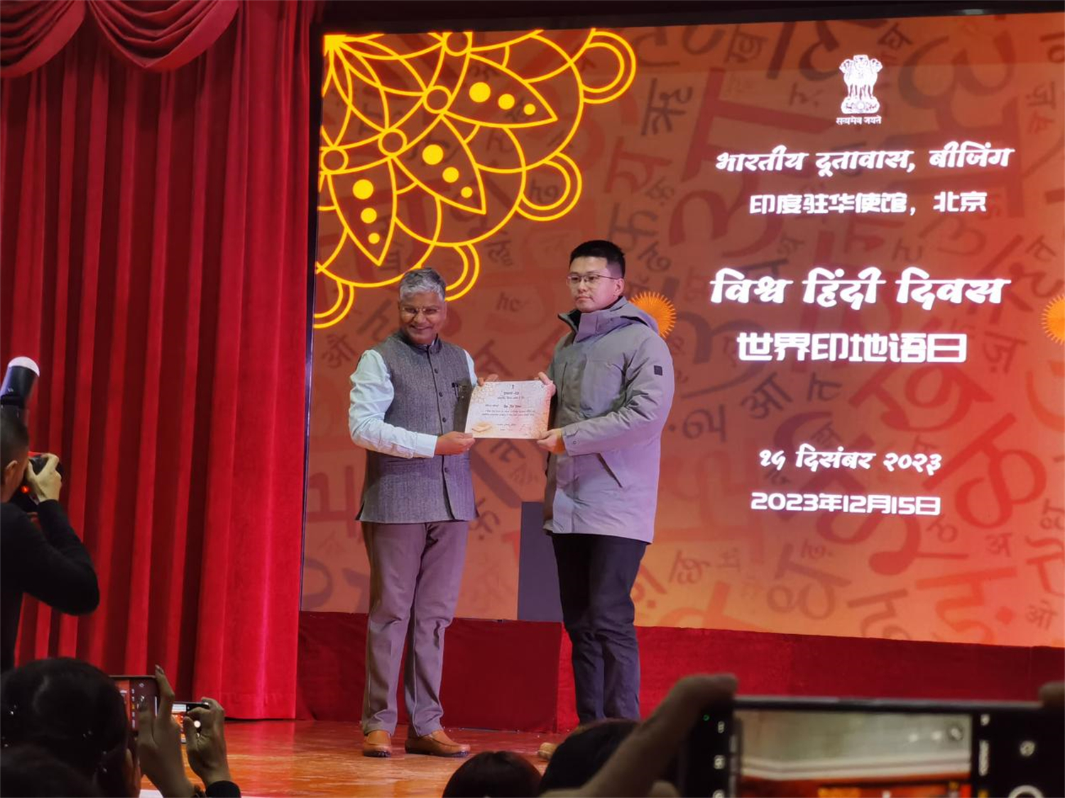 庆祝活动在印度驻华大使罗国栋(Pradeep Kumar Rawat)先生及学界前辈的致辞中拉开帷幕。庆祝活动包括“印地语诗歌朗诵比赛”和“印地语节目展演”等环节,来自北京大学、清华大学、北京外国语大学、中国传媒大学、北京第二拼搏手机版登录入口等高校师生和中国国际广播电台国际在线印地语部记者以及在京印度留学生参加该庆祝活动。我院南亚学系印地语专业师生在活动中表现优异,取得佳绩:2021级印地语专业本科生李依诺在“印地语诗歌朗诵比赛”中获最佳表现奖,2021级和2023级印地语本科生的积极展演获得赞誉,我院印地语专业喜获“优秀组织奖”,印地语专业教师代表王靖、贾岩获“优秀指导奖”。