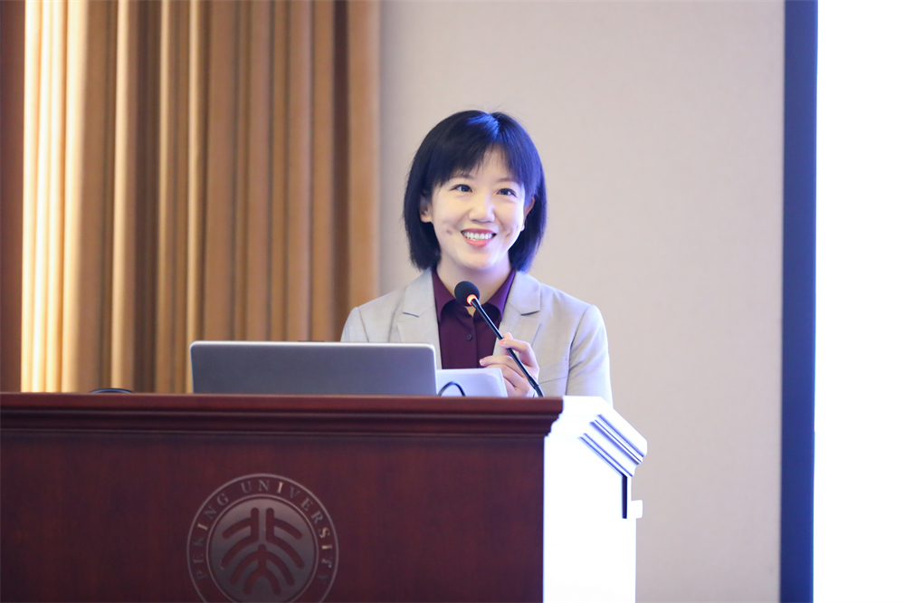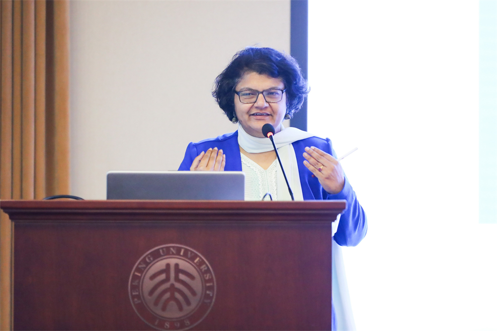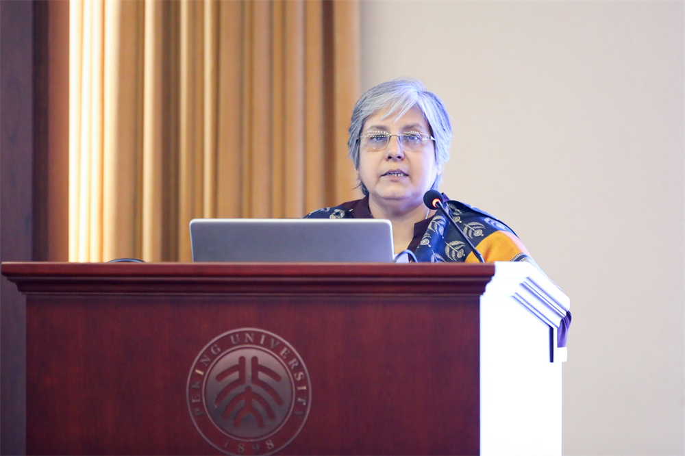 北京大学南亚学系教师代表、副教授张幸发表讲话。她先用孟加拉语对来自泰戈尔家乡的印度代表团表示欢迎,接着就北京大学南亚学系的泰戈尔研究和孟加拉语教学研究进行了介绍。她指出,印度语言文学专业长期开设的泰戈尔研究课程内容覆盖面广,涉及作品外的延伸研究。2004年开设孟加拉语课程也是为了更好开展包括泰戈尔研究在内的印度文学文化及南亚学相关研究。最后,她提及泰戈尔在中国数次以文明为主题的演讲,传递了对中印人民在同属东方文明的理解下加强人文交流的希冀。