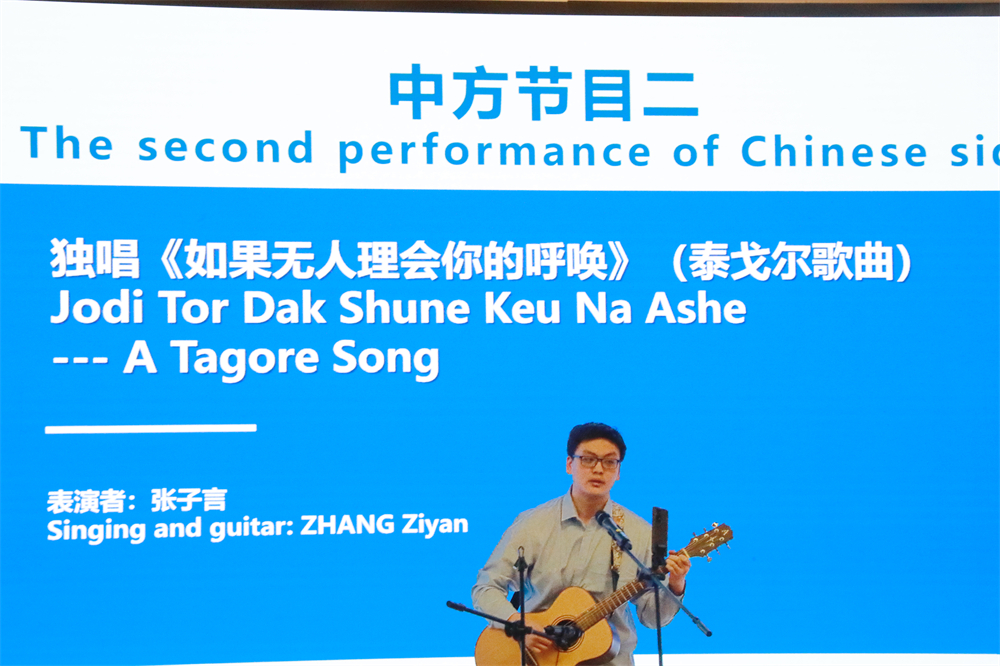 随后北京大学南亚学系研究生孟加拉语课程的同学们表演了孟加拉语集体朗诵《童谣》和泰戈尔歌曲吉他弹唱《如果无人理会你的呼唤》。