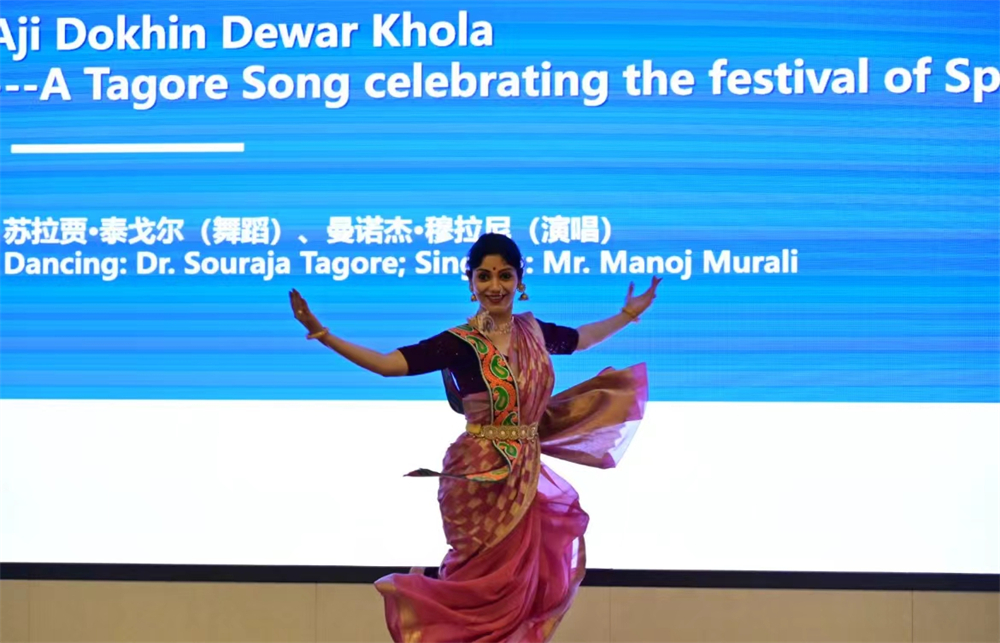 随后,印方艺术家代表苏拉贾·泰戈尔、曼诺杰·穆拉尼以歌舞形式演绎泰戈尔歌曲。在悠扬的曲调与灵巧的舞步中,庆祝春天到来的《今日南方之门已开启》和歌颂自然与生命的《天空中太阳繁星闪耀》赢得阵阵掌声。