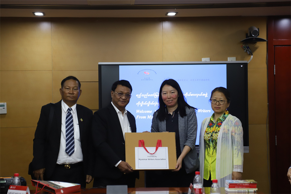 致辞结束,缅甸作家代表团与缅甸语专业师生用缅语交流。本科四年级学生尚晋豪介绍了北京大学的光荣传统与历史;缅语教研室主任张哲老师代表专业介绍了北大缅语专业的历史沿革、1949年至今的人才培养、教材建设、课程建设和科研成果,向代表们展示由缅语教研室教师出版的《缅甸诗选》、《缅甸方言研究》等语言、文学类专著、译著。杨国影副教授详细介绍近五年来缅甸语教研室已翻译出版和正在计划出版的缅甸文学作品,包括《如愿》、《雨夜雾梦》、《等待花开之时》、《六边形》、《缅甸短篇小说选》、《缅甸儿童文学作品选》等。