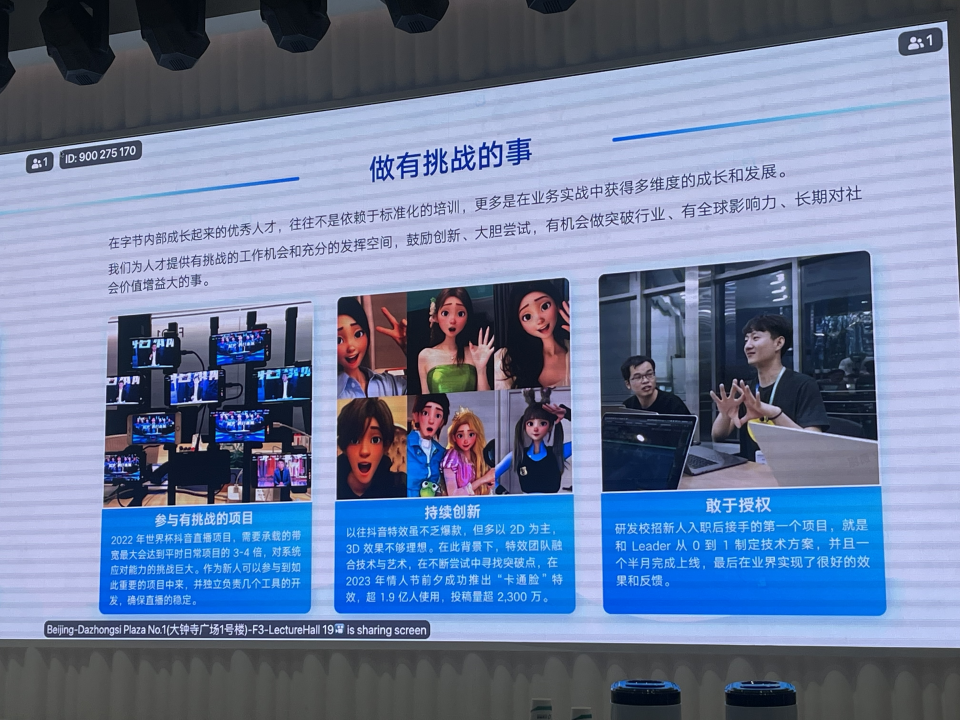 同时,加入字节跳动,意味着踏上一条快速成长的赛道。公司设立的Bootcamp训练营、Mentor制度(六个月一对一导师指导)及“星火计划”等,为员工提供了系统化的学习资源和个性化职业发展路径。无论是提升好奇心、增强领导力,还是专攻技术深造,丰富的相关课程为员工的每一步成长加油助力。