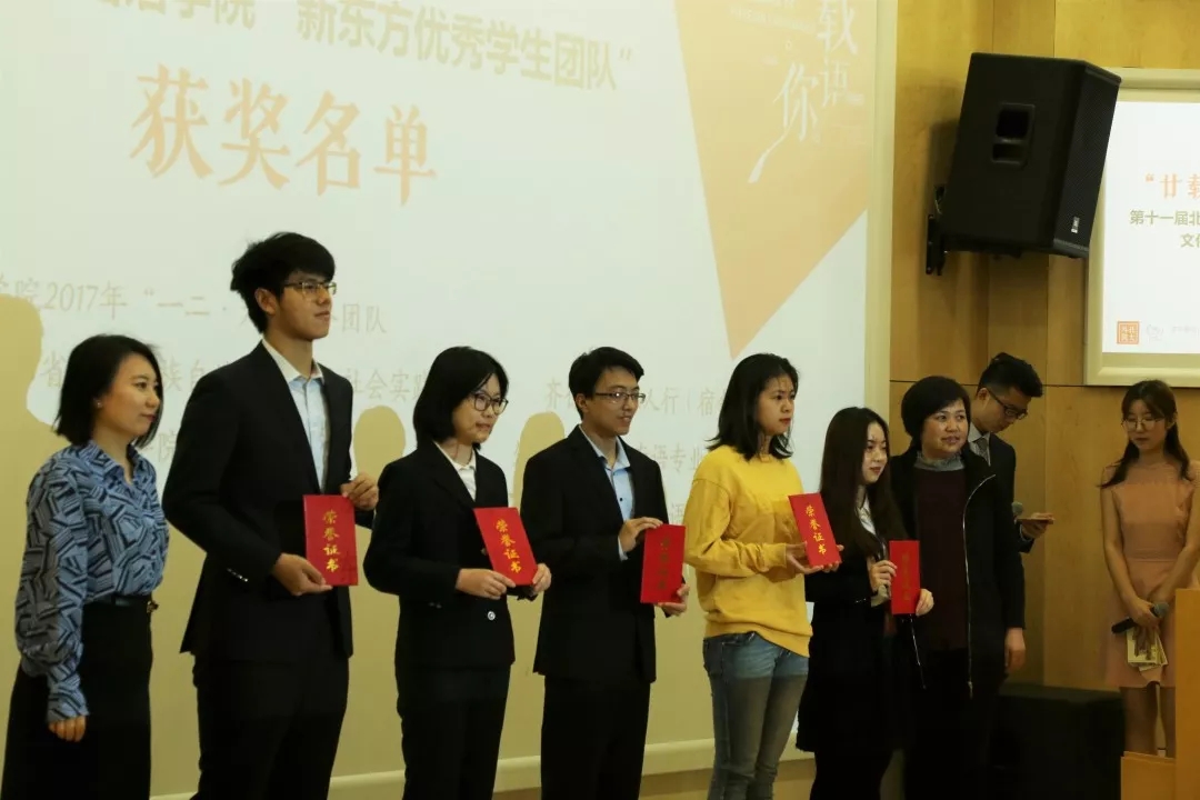 接下来进行的“新东方优秀学生团队”颁奖仪式中,10支获奖团队代表上台领奖,李淑静、高静、付志明、宋扬上台为获奖代表颁奖。之后,“新东方优秀学生团队”获奖团队代表、拼搏手机版登录入口2018级亚非语言文学硕士研究生许洋分享东南亚华文教育调研小组团队实践收获。