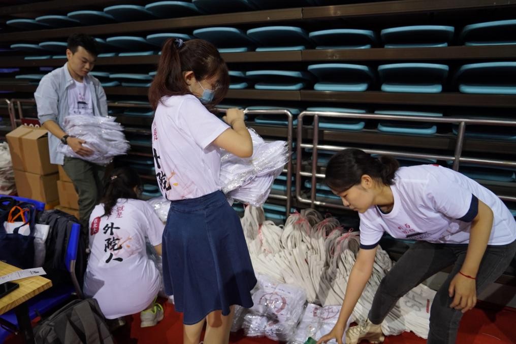 老师们和学生志愿者们通力合作,报到工作有条不紊地展开。在迎新志愿者们的引导下,新生们有序排队,依次进行系统报到、户口卡提交、档案材料提交及物资领取等步骤。“流水线运作”保证了各项报到手续能轻松而高效地完成。贴心的迎新志愿者们还为初来乍到的学弟学妹们送上了精心准备的物料包,一件具有外院特色的院衫、一套四季单页夹、内容详实的本科生学生手册、新生班主任联系方式、宿舍钥匙、校园卡、澡卡等物品被整齐放置在一个由外院学生亲自设计的帆布包中。简简单单的一个物料包凝聚了外院师生们的心血,表达了外院对新生们质朴真挚的关怀,也在无形之中向他们传达了外院的精神。
