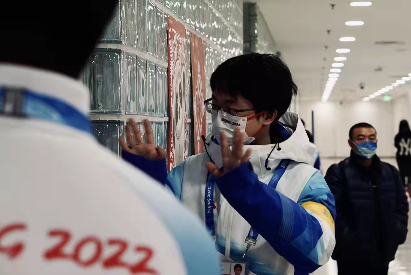 有时,回程却不那么顺利。送走客户后,错过了末班车的辛婷毅在2月5日晚被独自一人困在了首都体育馆。经过老师的协商,她终于顺利回到了驻地。抵达时,时间已近十二点,驻地老师就在一盏路灯下等着接她,“老师一上来就替我重新围好松开了的围巾,还叮嘱我早点回去睡觉。” 深夜的北京,温度已降至零下,这份温暖将她包裹,使她不惧寒风。无数个细小的善意相连,“感动”便成了辛婷毅为自己的志愿者工作选择的最重要的关键词。