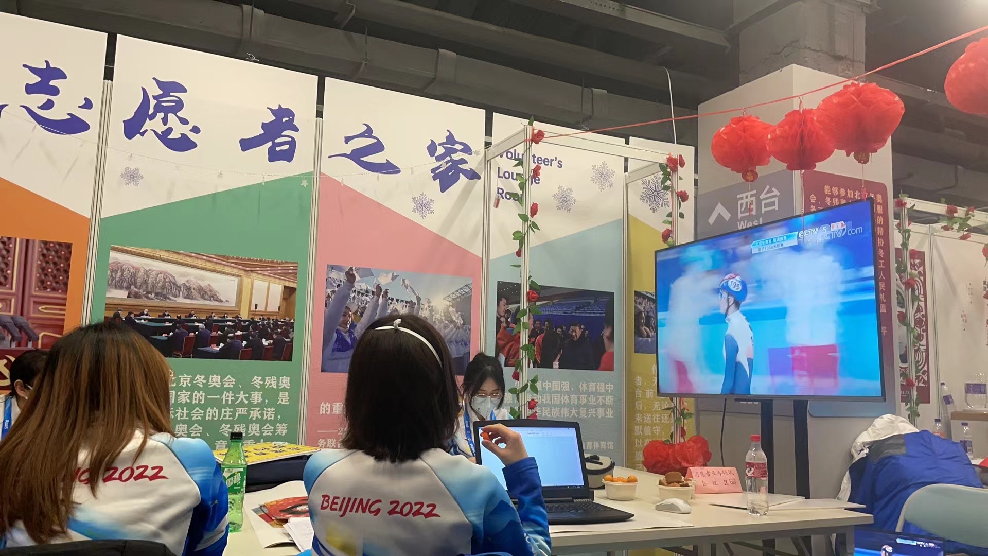 另一边,首都体育馆内,速度滑冰混合团体接力赛决赛的发令枪已经鸣响。三楼志愿者之家里,奥林匹克大家庭助理辛婷毅与场馆内的其他志愿者一起,紧紧盯着电视屏幕里的战局。一小时前,辛婷毅按照客户的的日程表,陪同他来场馆观赛,与场馆礼宾志愿者交接后,她就迅速去了志愿者之家观赛。由于信号的轻微延迟,电视中的各国运动员们还在进行最后三圈的滑行争夺,她的耳畔已经传来了一楼观众排山倒海的欢呼,“当时我们里面的人就知道了,可能中国夺冠了!”果然,当她回过神看电视时,画面中的武大靖完成了最后的冲刺,第一位冲过了终点线,“顿时,志愿者之家就沸腾了!”此时的首都体育馆中被庆祝的欢呼声填满,无论是观众还是志愿者都沉浸在中国队首金的喜悦之中。