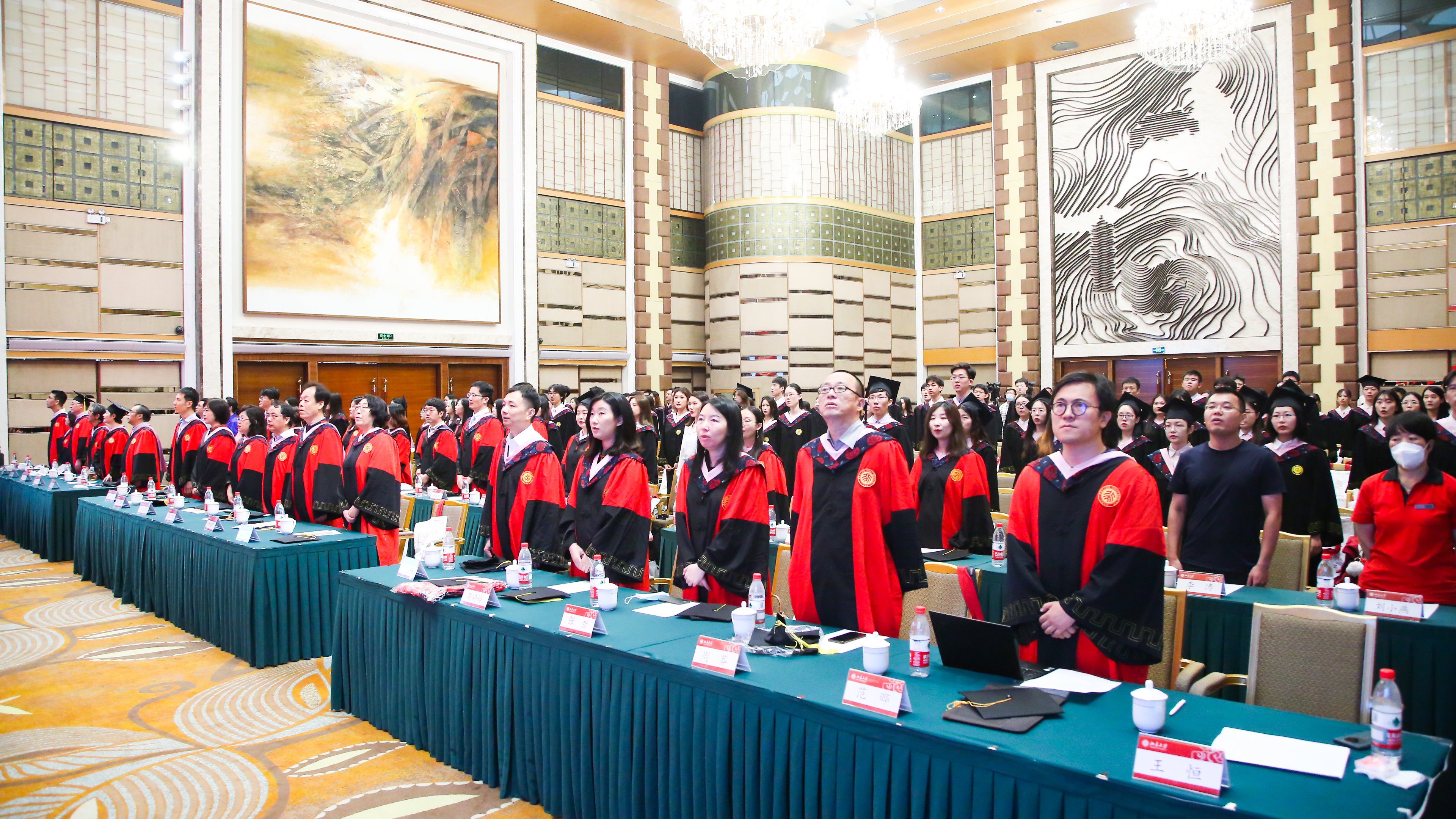 典礼行将结束,全体师生起立合唱《燕园情》。“燕园情,千千结”,连接的是所有外院人的心,不变的是永恒炽热的师生情和同学情。“眼底未名水,胸中黄河月”,荡漾的是北大外院学子的爱国之情,照亮的是奔赴广阔天地的奋斗之路。毕业生们用歌声作别,唱出了对彼此对师长的感激,唱出了对北大和外院的不舍,也唱出了建设新时代,踏上新征程的壮志豪情。