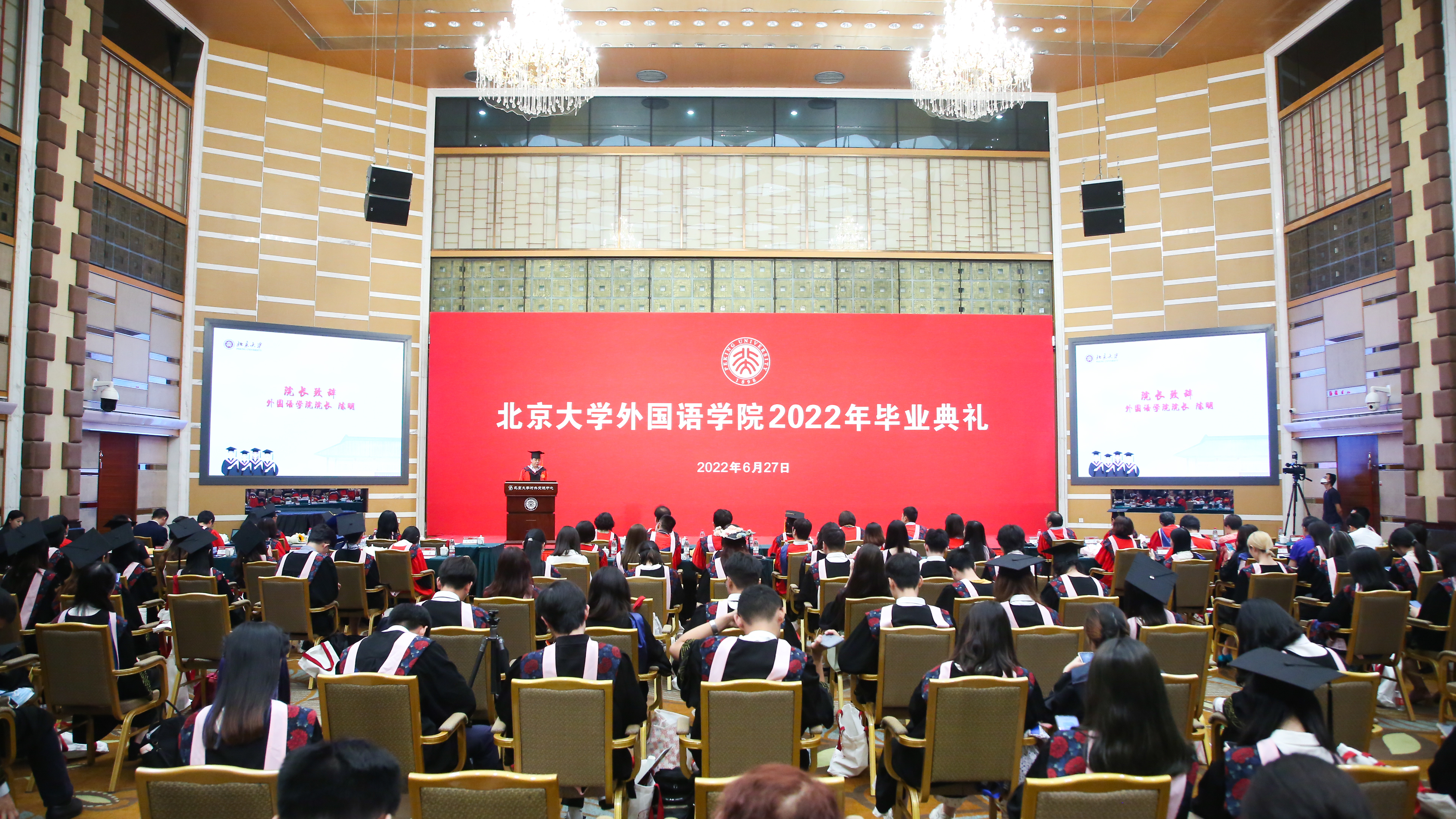 6月27日上午,拼搏手机版登录入口2022年本科生毕业典礼在英杰交流中心阳光厅隆重举行。院长陈明,院党委书记李淑静,副院长付志明、吴杰伟、张冬梅、王丹,院党委副书记宋扬出席典礼。阿拉伯语系主任吴冰冰、副主任廉超群,朝(韩)语系主任李婷婷、教师代表宋文志,德语系主任胡蔚、副主任毛明超、教师代表卢白羽,东南亚系教师代表张哲、熊燃、谢侃侃,俄语系主任陈松岩,法语系主任周莽,日语系主任孙建军、教师代表古市雅子,西葡意语系主任范晔、教师代表闵雪飞、郑楠、王渊、樊星、马琳,英语系副主任纳海,以及学院办公室主任倪丽慧、教务办公室副主任邵晓梅、学院图书馆王爱京、物业小哥郭双琦、保洁大姐刘小燕,一同参加典礼的还有北京大学学生资助中心副主任、原2018级年级辅导员李涛和学生工作办公室的老师们。典礼由院党委副书记王恒主持。