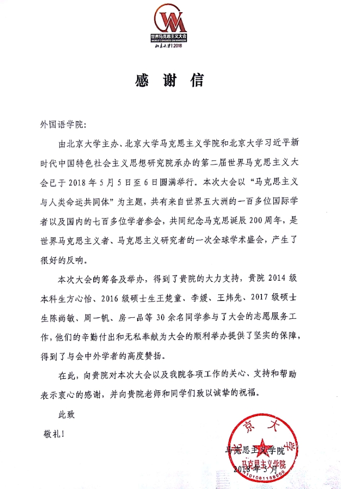 期间,拼搏手机版登录入口师生高度重视并支持此次盛会,积极投身语言翻译及志愿者招募工作,获得主办单位高度评价。据统计,2014级本科生方心怡、2016级硕士生王楚童、李媛、王炜先、2017级硕士生陈尚敏、周一帆、房一品等30余名同学参与了大会的志愿服务工作,他们的辛勤付出和无私奉献为大会的顺利举办提供了坚实的保障,得到了与会中外学者的高度赞扬。马克思主义学院特发来感谢信,对他们的支持和帮助表示衷心的感谢。