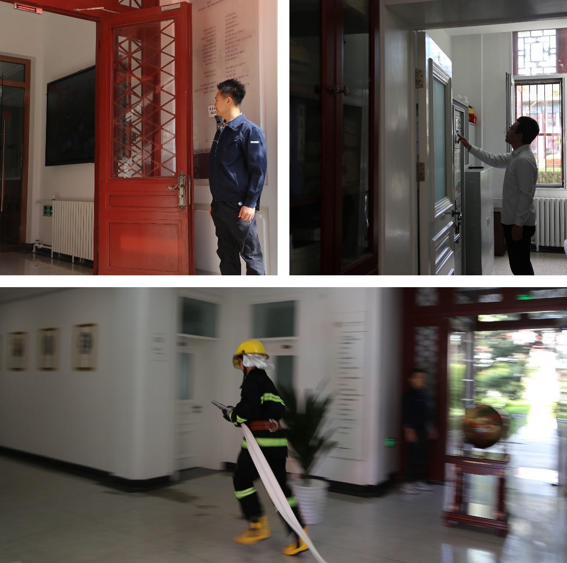 本次消防疏散演习以外文楼103教室突发火情为背景,随着张冬梅副院长宣布演练开始,警报铃声响起,中控室值班人员通过查看主机显示屏确定报警位置后,迅速携带应急包到现场确认火情,当发现火情无法控制时,即刻通知值班室值守人员请求支援。值班人接到报讯后迅速启动应急预案,微型消防站人员即刻启动消防栓灭火,并依次打开楼内应急广播和声光报警器。每一层的疏散负责人立刻到位,冷静有序地组织楼内人员进行疏散。